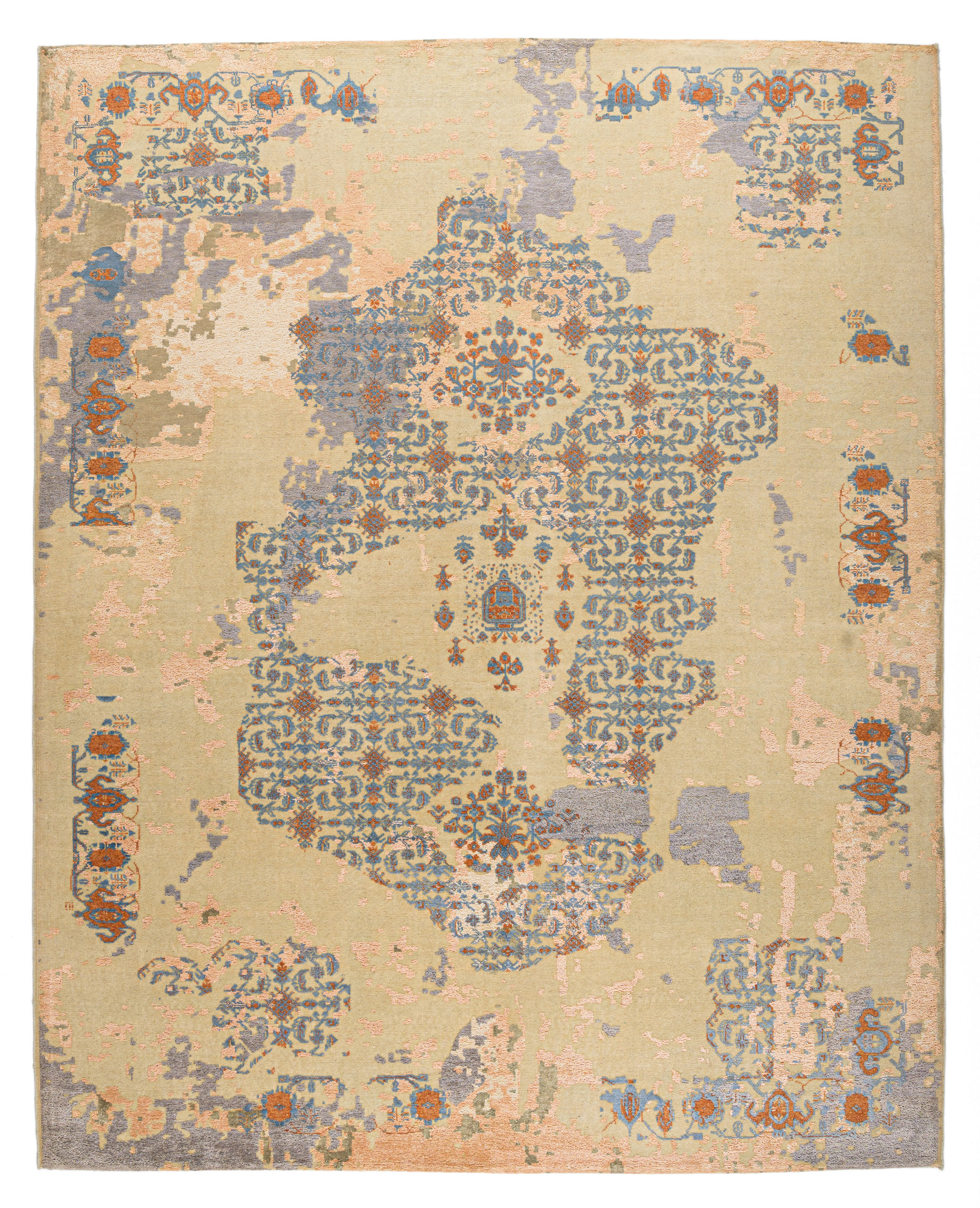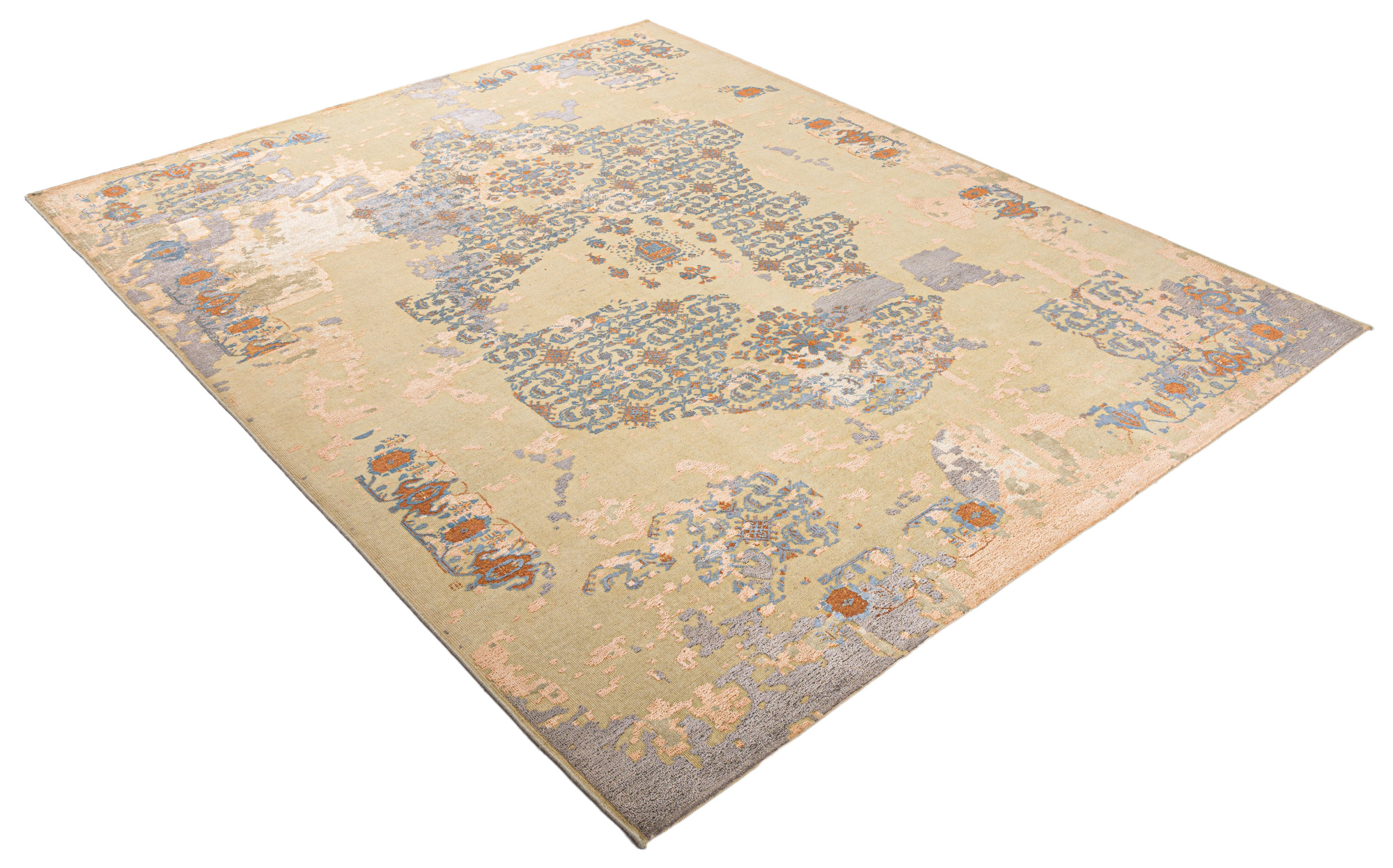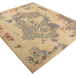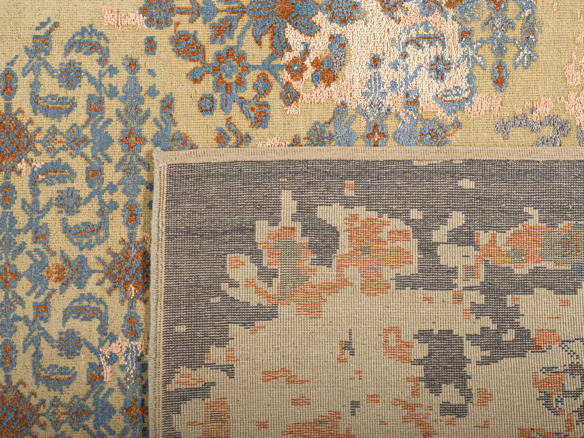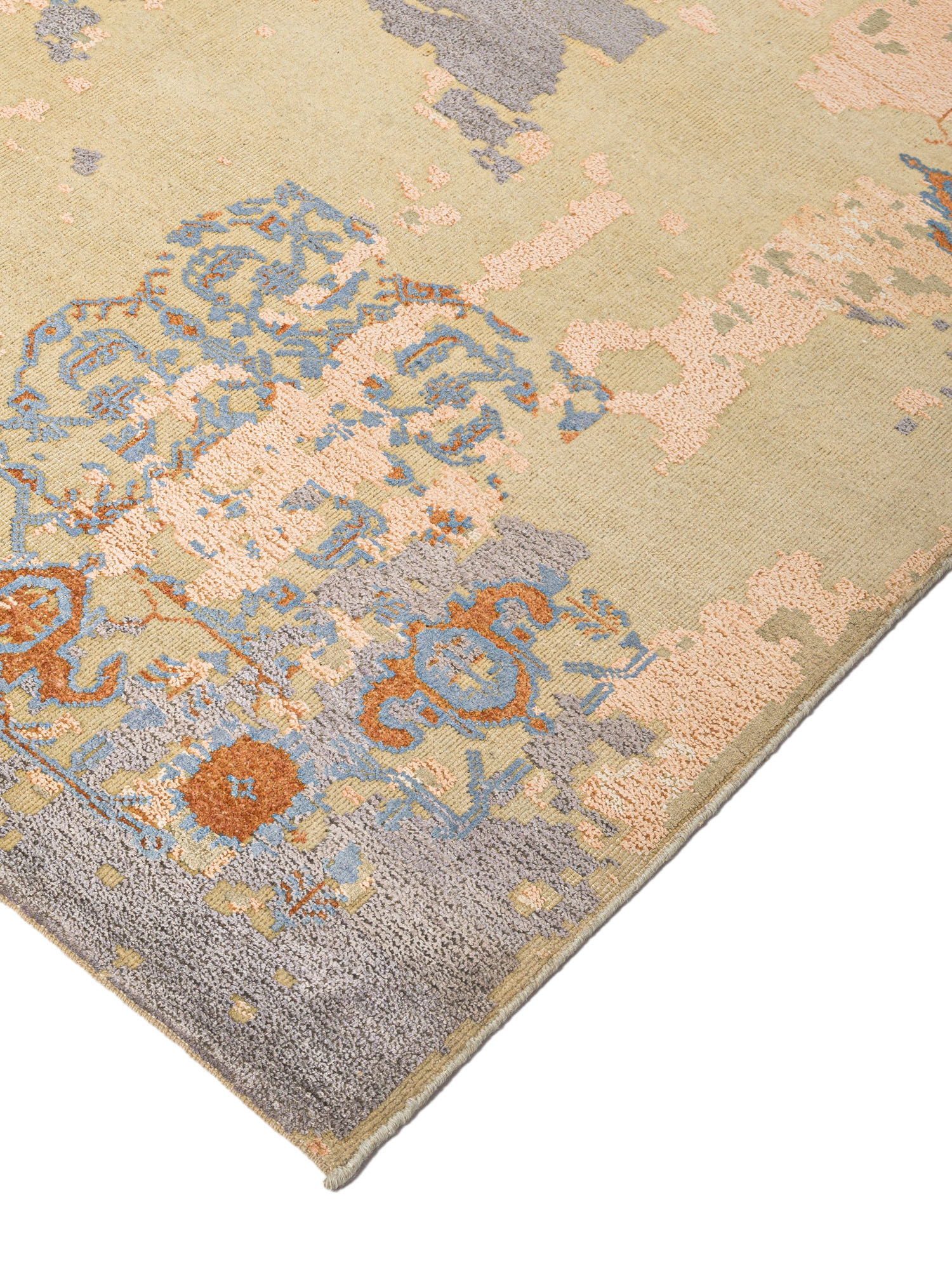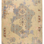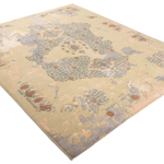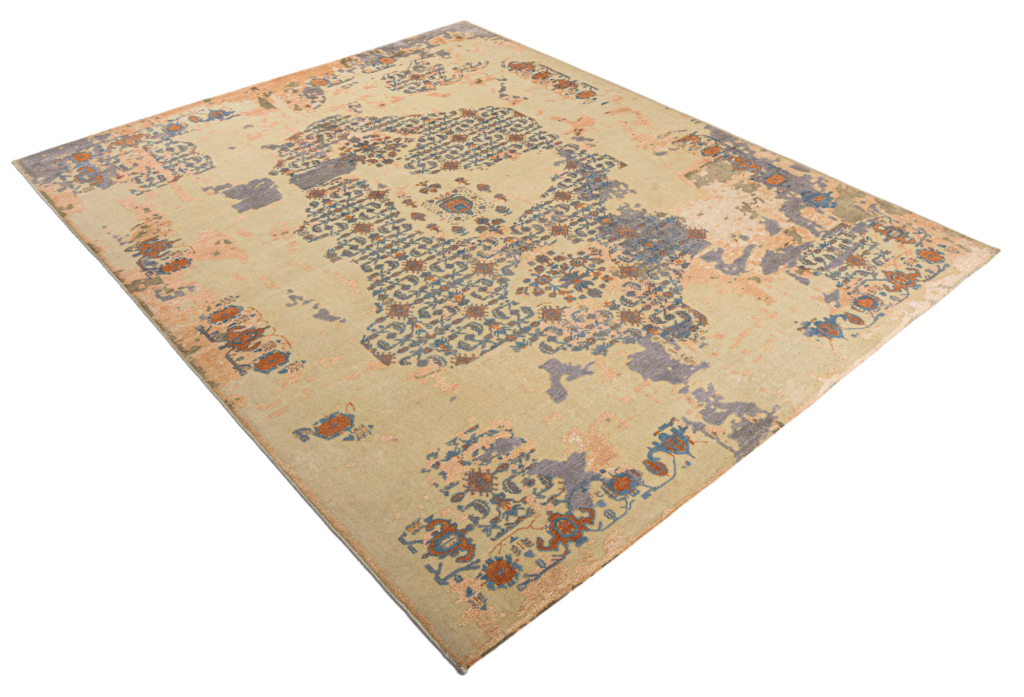 The contemporary classic rug is hand-knotted by artisans in a nice blend of wool and bamboo silk. New Zealand wool is the most durable material, but bamboo silk gives luxurious shine, softness and structural effect. All yarns have been dyed separately by dying master. The rug’s pile has been cut to minimum height to look more vintage-like.