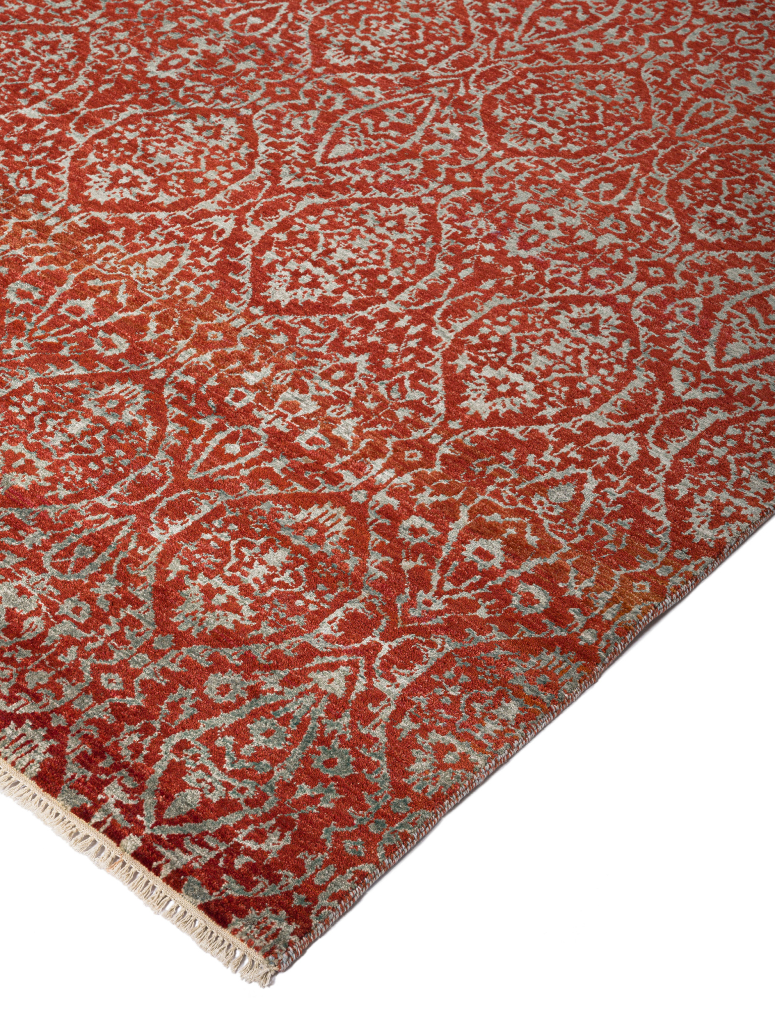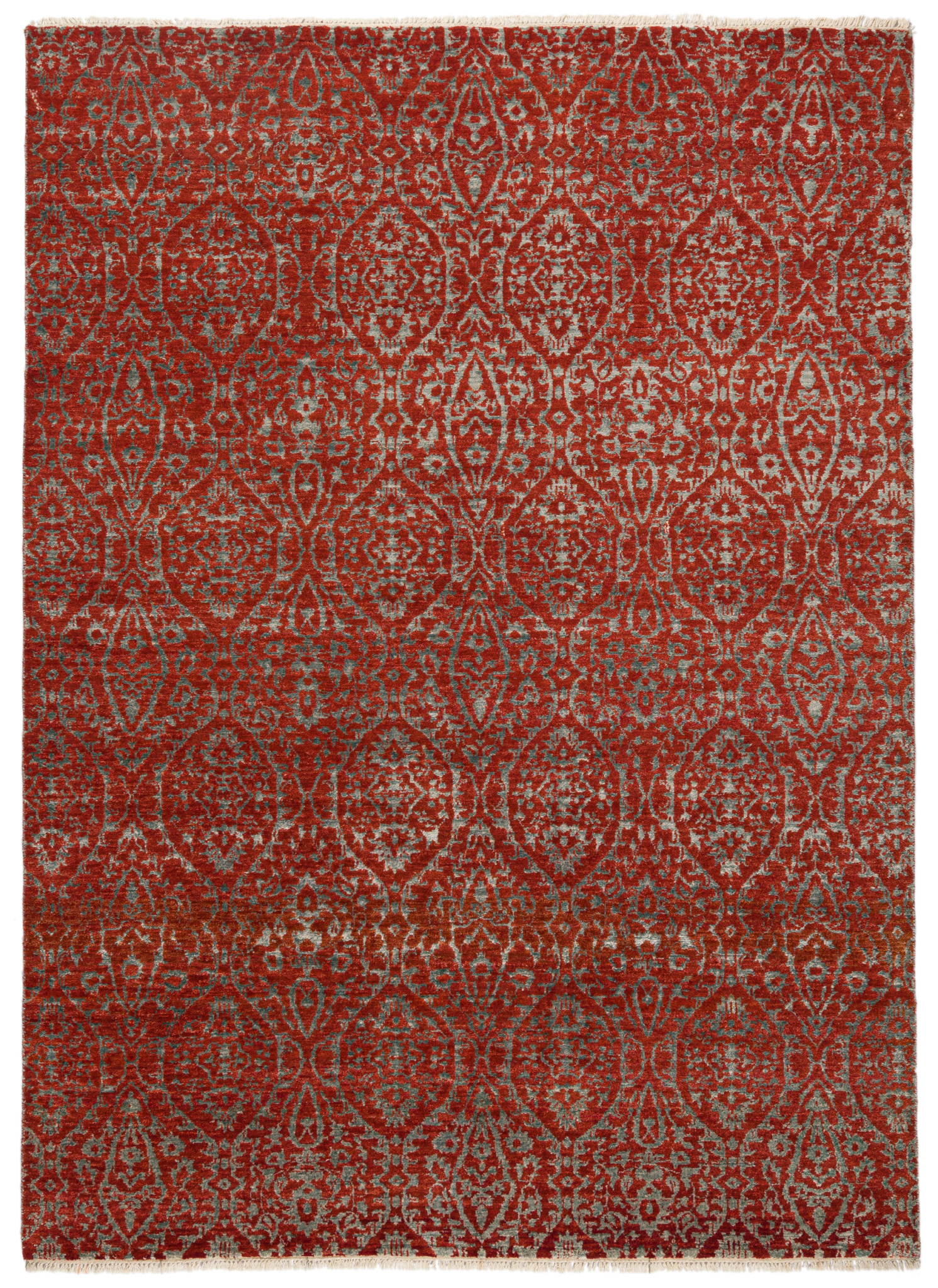 The contemporary classic rug is hand-knotted by artisans in a nice blend of wool and bamboo silk. New Zealand wool is the most durable material, but bamboo silk gives luxurious shine, softness and structural effect. All yarns have been dyed separately by dying master.
