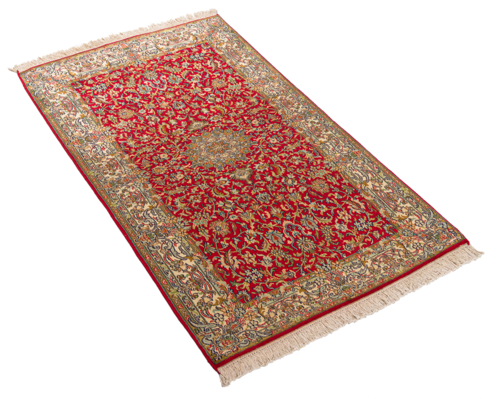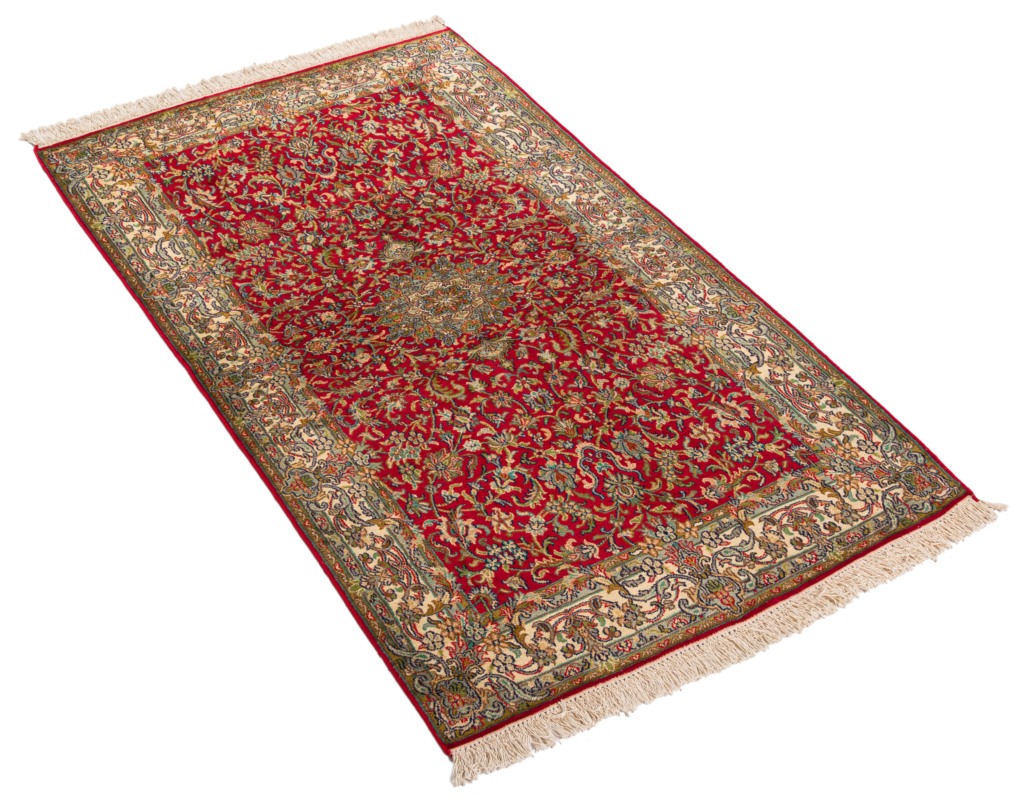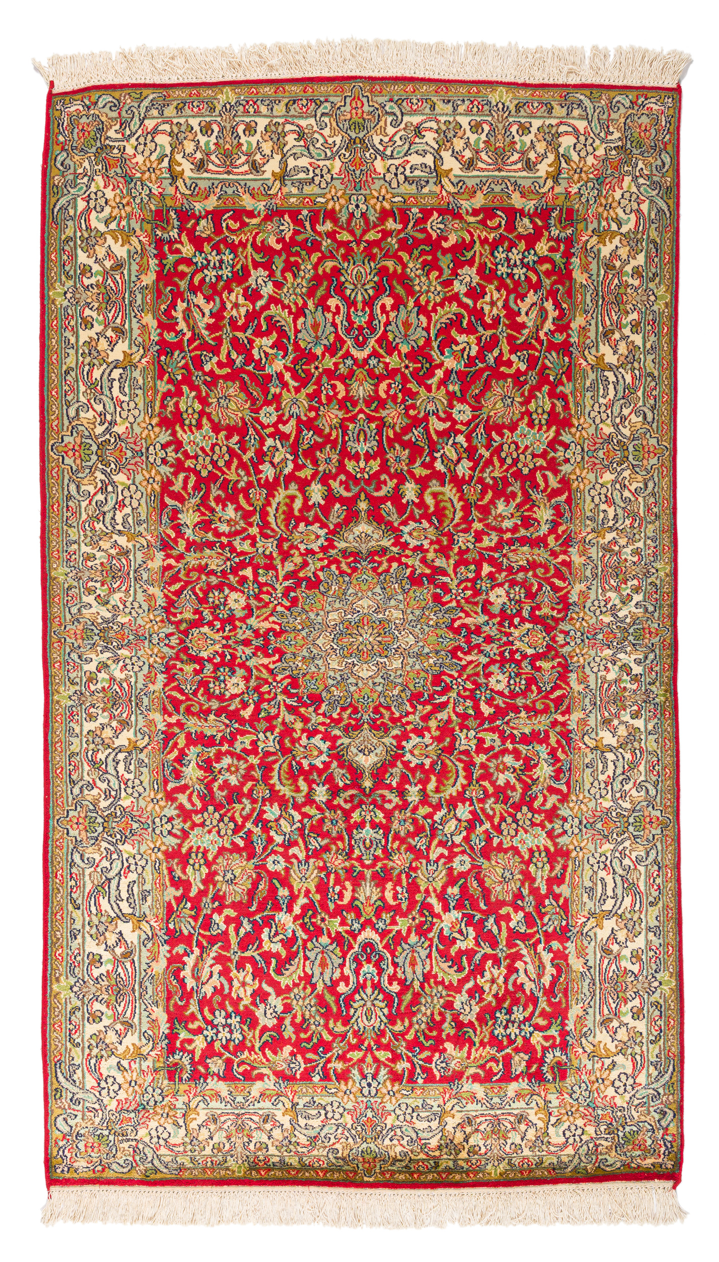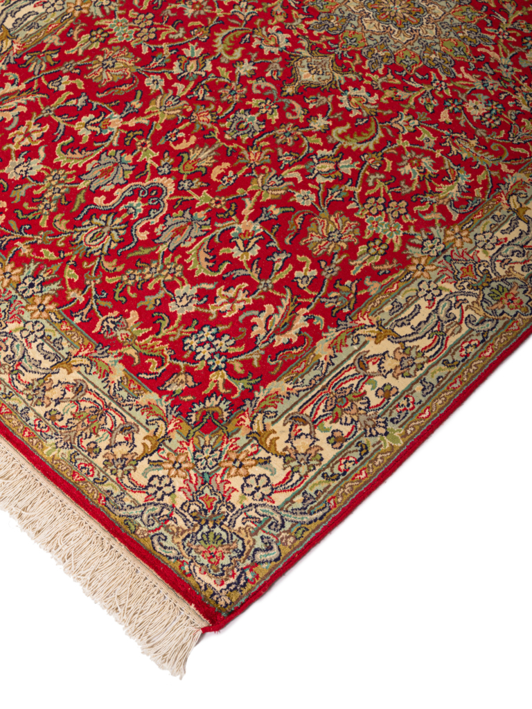 Kashmir silk rugs are hand-knotted in Kashmir region. The oriental patterns of the rugs consist partly of medallions and repeating patterns, but with a typical garden motif.