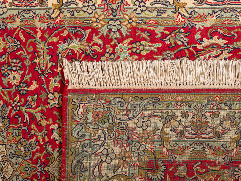 The rugs are of very high quality and thanks to its finest pure silk material selection and knotting density, they are thin and light, with a beautiful luxurious shine. Also, the use of silk makes detailed patterns possible, and the precision of the work behind the loom is impressive. Kashmir Silk rugs are One of a Kind oriental artworks.