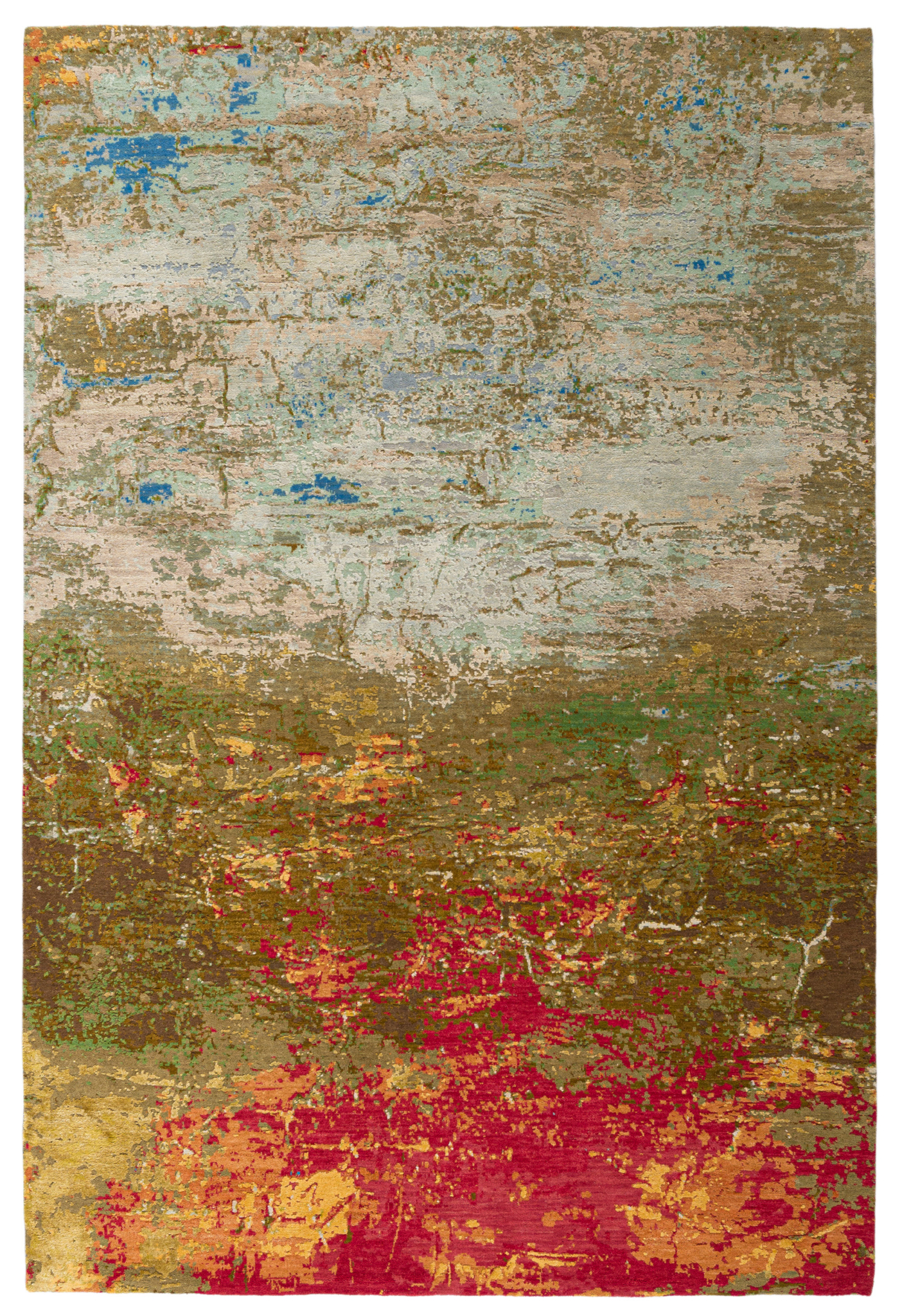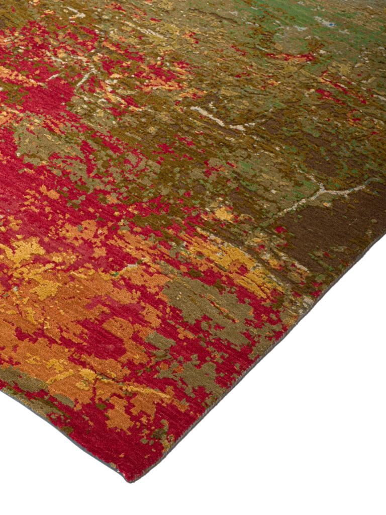 The modern rug is hand-knotted by artisans in a nice blend of wool and pure silk. New Zealand wool is the most durable material, but pure silk gives luxurious shine, softness and structural effect. All yarns have been dyed separately by dying master.