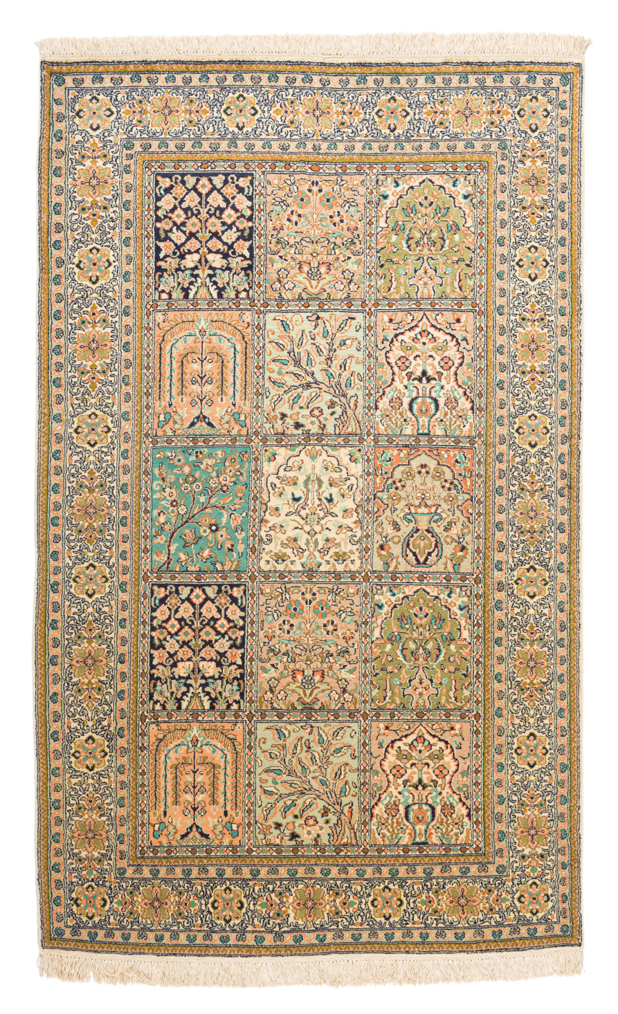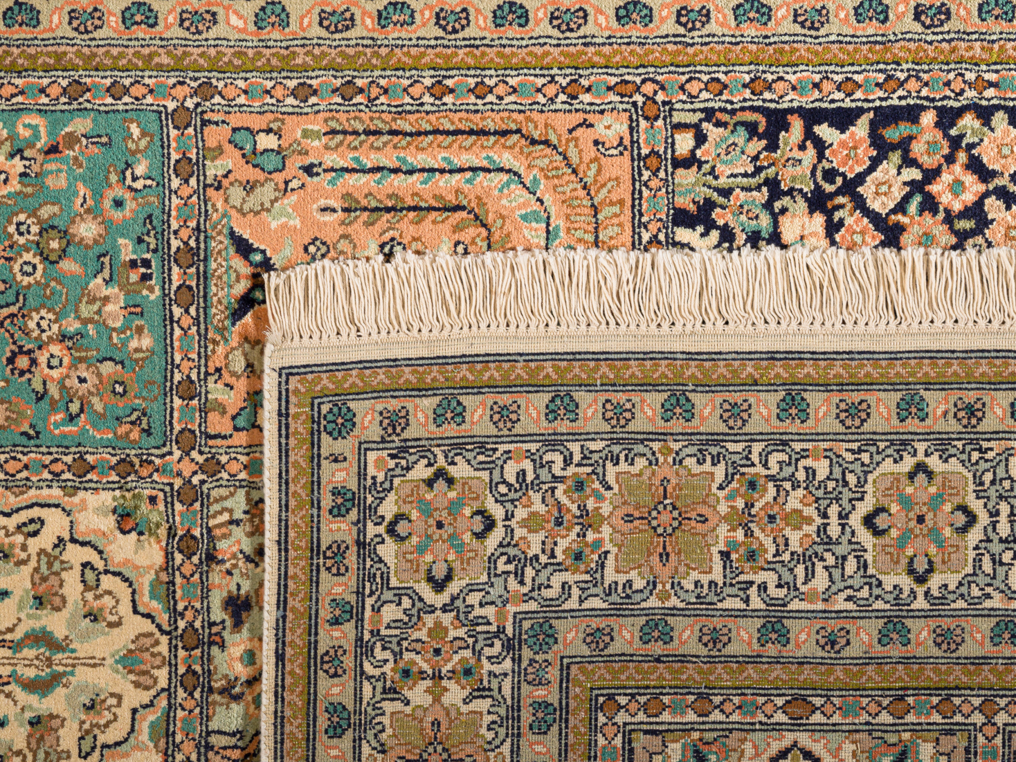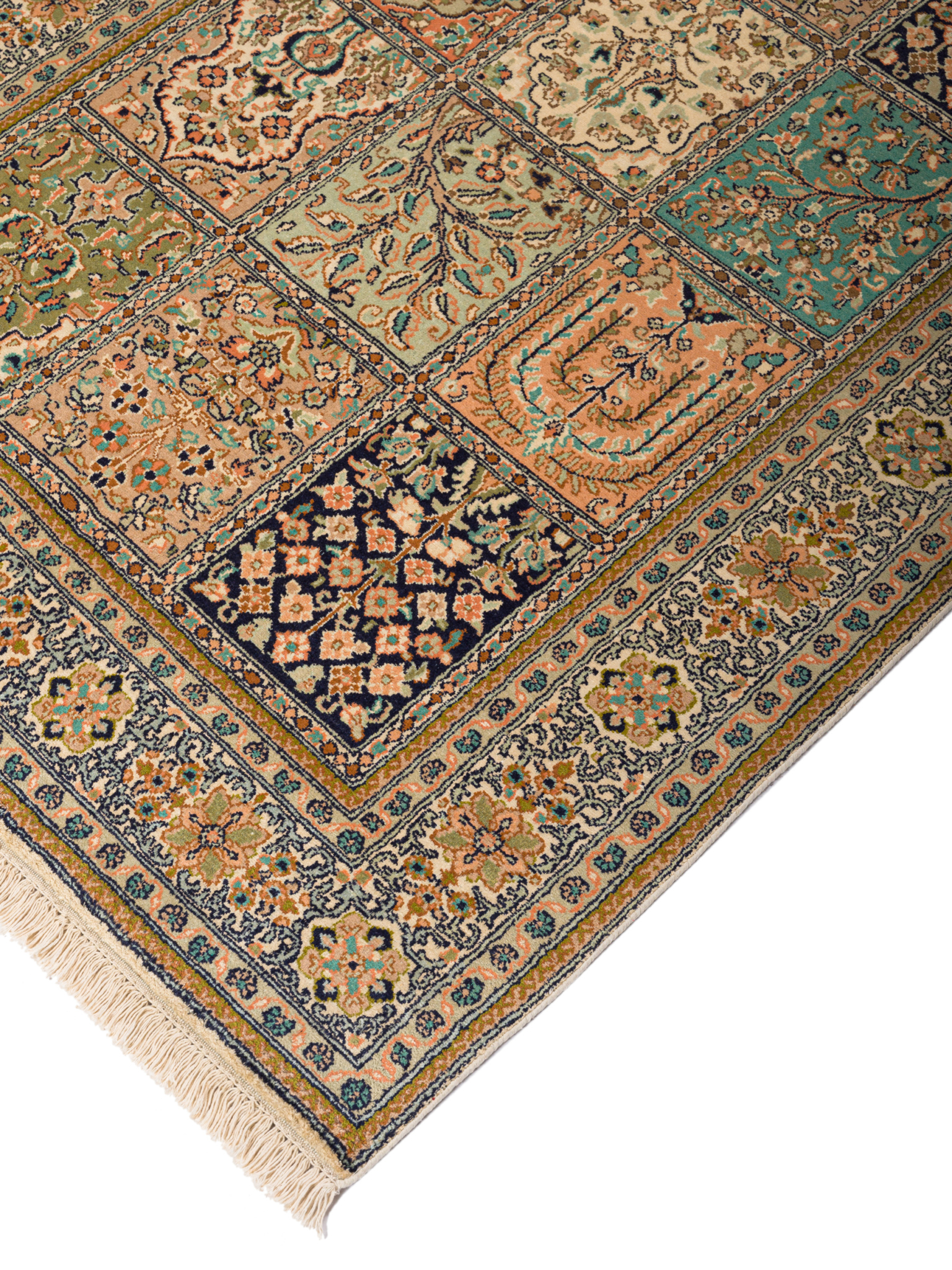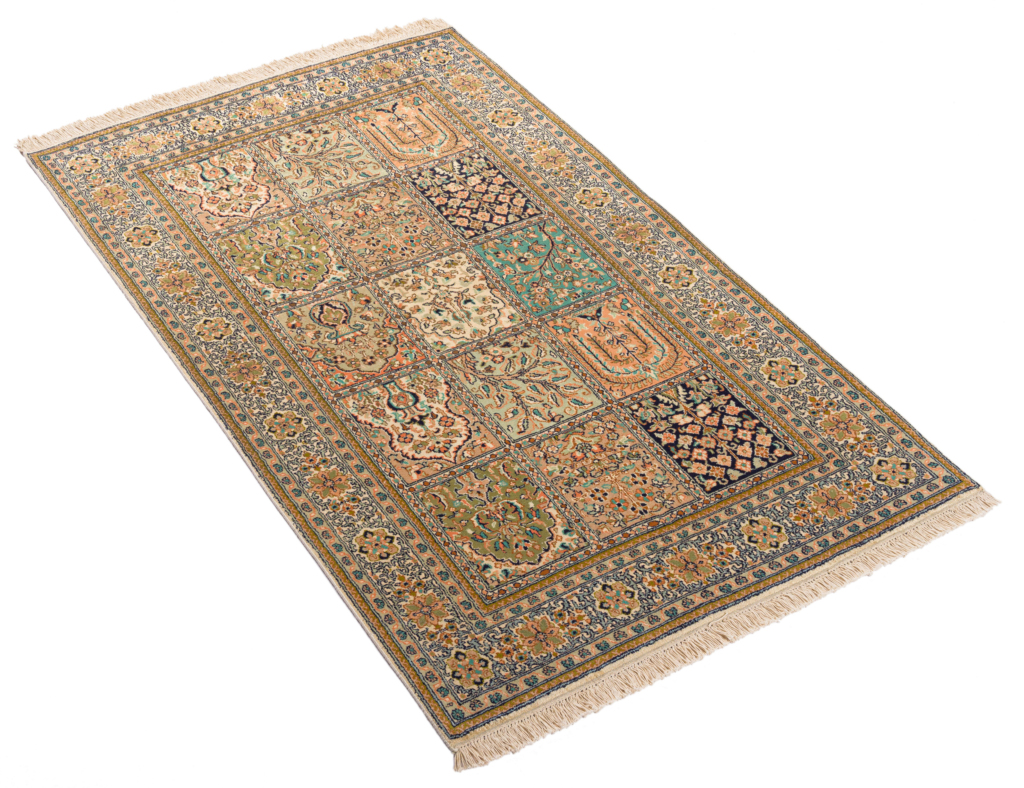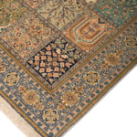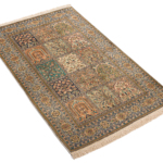 Kashmir silk rugs are hand-knotted in Kashmir region. The oriental patterns of the rugs consist partly of medallions and repeating patterns, but with a typical garden motif.