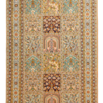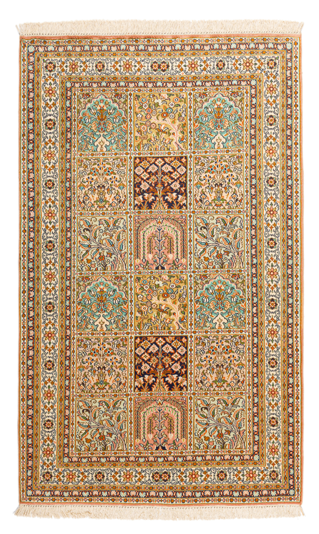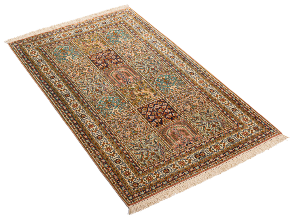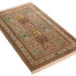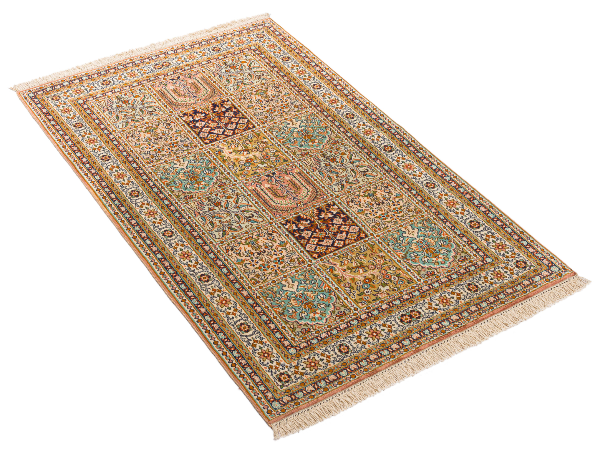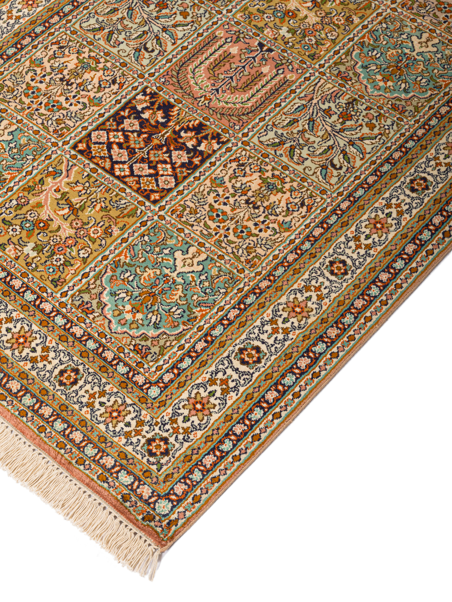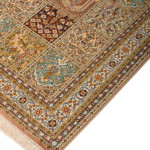 Kashmir silk rugs are hand-knotted in Kashmir region. The oriental patterns of the rugs consist partly of medallions and repeating patterns, but with a typical garden motif.
