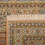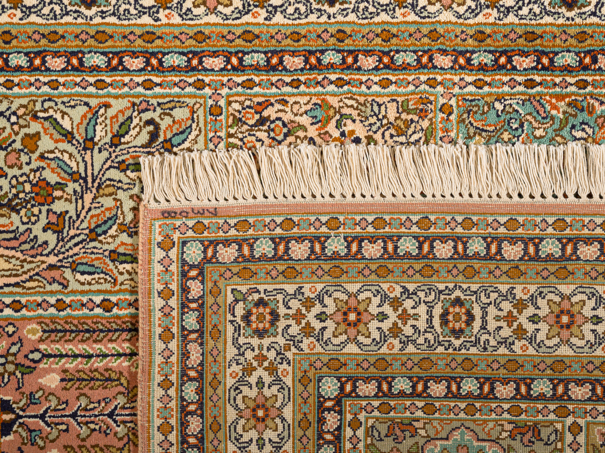 The rugs are of very high quality and thanks to its finest pure silk material selection and knotting density, they are thin and light, with a beautiful luxurious shine. Also, the use of silk makes detailed patterns possible, and the precision of the work behind the loom is impressive. Kashmir Silk rugs are One of a Kind oriental artworks.