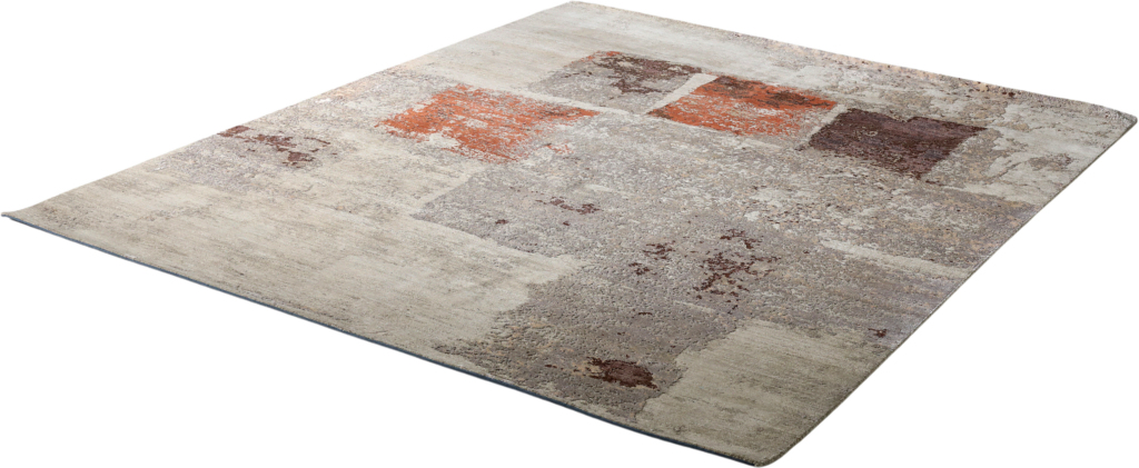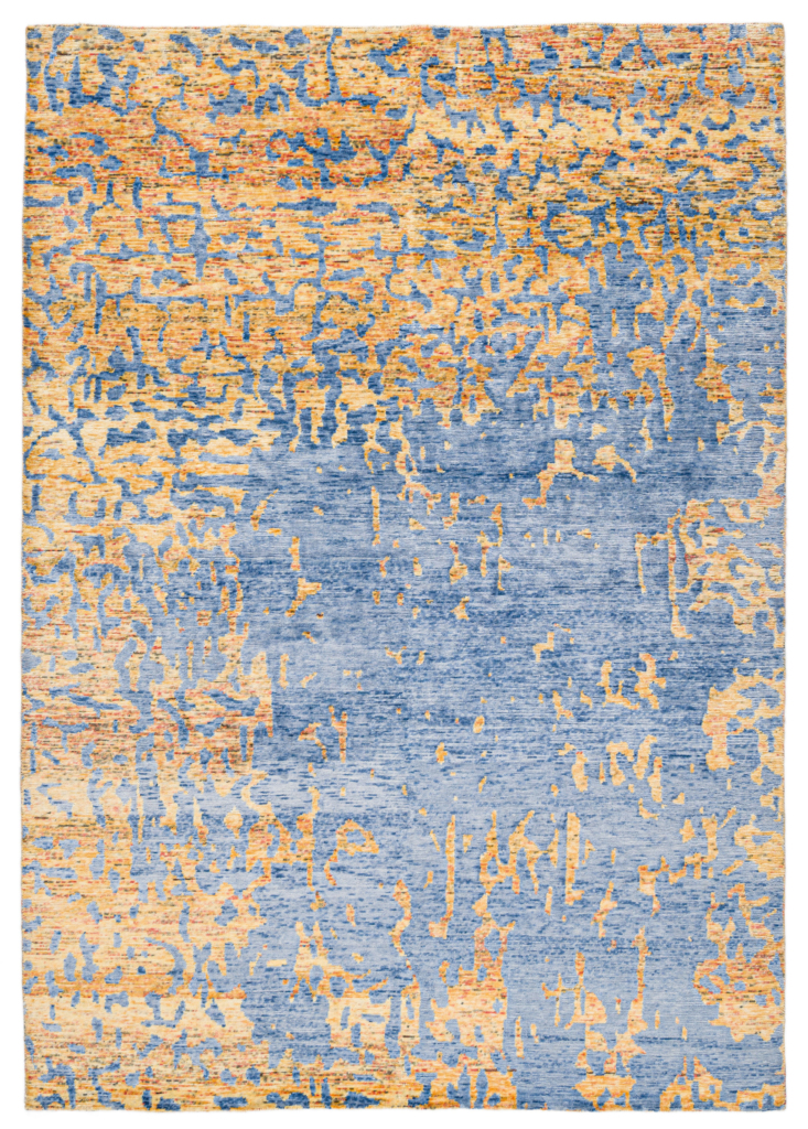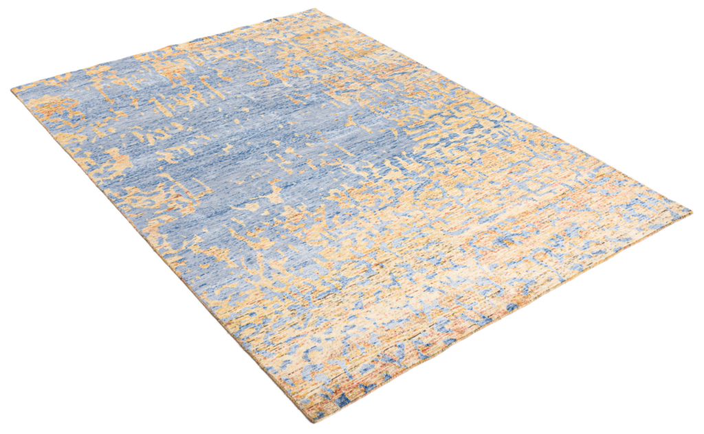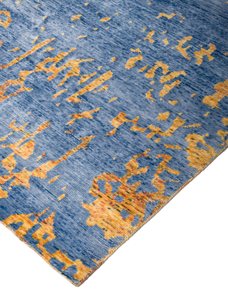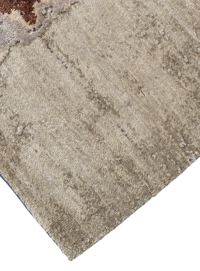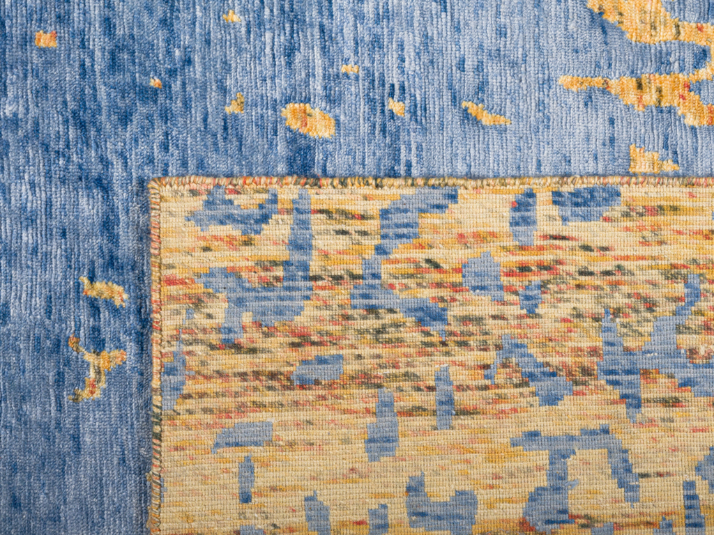 The modern rug is hand-knotted by artisans in a nice blend of wool and pure silk. New Zealand wool is the most durable material, but pure silk gives luxurious shine, softness and structural effect. All yarns have been dyed separately by dying master.